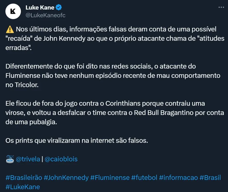 “En los últimos días, informaciones falsas han revelado una posible ‘recaída’ de John Kennedy en lo que el propio atacante llama ‘actitudes equivocadas’. Contrariamente a lo dicho en las redes sociales, el delantero del Fluminense no tuvo episodios recientes de mal comportamiento en el Tricolor. Las impresiones que se hicieron virales en Internet son falsas”, explayó el jornalista de Trivela con respecto a la situación del atacante, donde también reflejó que las ausencias fueron por los motivos anteriormente mencionados.
