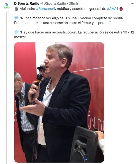 Desde Argentinos Juniors rompieron el silencio en las últimas horas, luego de que Alejandro Roncoroni, médico y secretario general de la institución de La Paternal, hiciera referencia a lo sucedido en términos profesionales. “Nunca vi algo así. Es una luxación completa de rodilla. Prácticamente es una separación entre el fémur y el peroné. Hay que hacer una reconstrucción”, dijo el experto sin poder salir de su asombro.