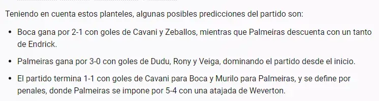 En esta oportunidad, el bot de Bing presentó al menos tres escenarios posibles para el desarrollo del juego de vuelta en Allianz Parque: una victoria por lado y un empate que termina en victoria de Palmeiras por penales.