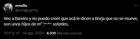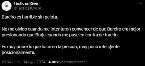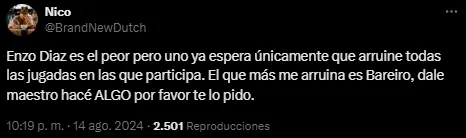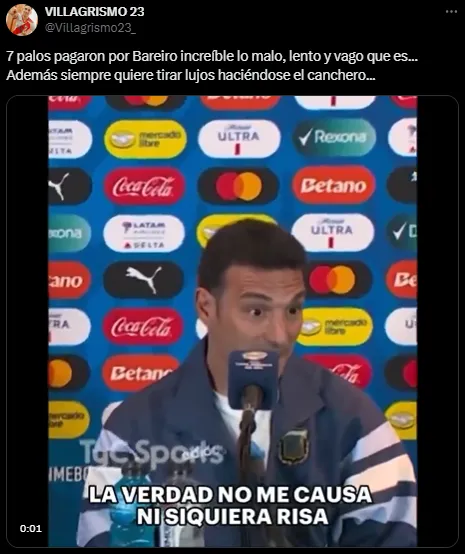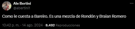 En redes sociales, Bareiro fue uno de los más criticados y señalaron principalmente su poca movilidad sobre el campo: “Increíble lo malo, lento y vago que es“. “El que más me arruina es Bareiro, dale maestro hacé algo por favor te lo pido“, comentó otro.