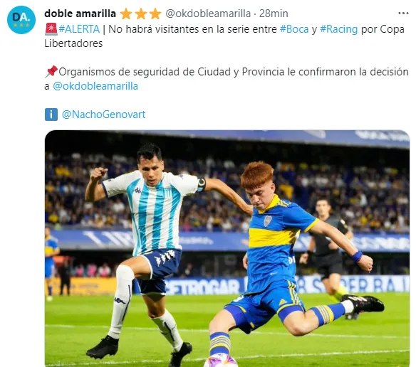 Según avanzó Doble Amarilla, la serie de cuartos de final de la Copa Libertadores entre Racing y Boca no contará con público visitante en los estadios. Esta decisión fue confirmada por organismos de seguridad tanto de la Provincia como de la Ciudad de Buenos Aires.