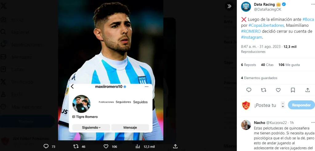 Tal fue el hostigamiento de los hinchas de Racing en las redes sociales una vez consumada la eliminación que el delantero tomó la decisión de cerrar su cuenta de Instagram, buscando abstraerse de los comentarios que a estas horas continúan apuntándolo como uno de los responsables del traspié.