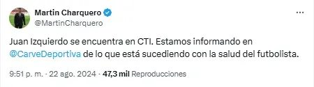 Tras el preocupante episodio vivido en Morumbí, el periodista Martin Charquero informó a través de sus redes sociales que Juan Izquierdo entró en terapia intensiva y está siendo seguido minuto a minuto por el equipo médico después de desplomarse en el campo de juego.