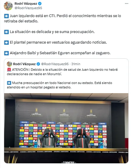 Por otro lado, el periodista Rodri Vázquez asegura que el futbolista perdió el conocimiento mientras era retirado en ambulancia del estadio y que el cuadro “es delicado y de suma preocupación”. Actualmente está acompañado por el presidente de Nacional, Alejandro Balbi, y el manager general del club, Sebastián Eguren.