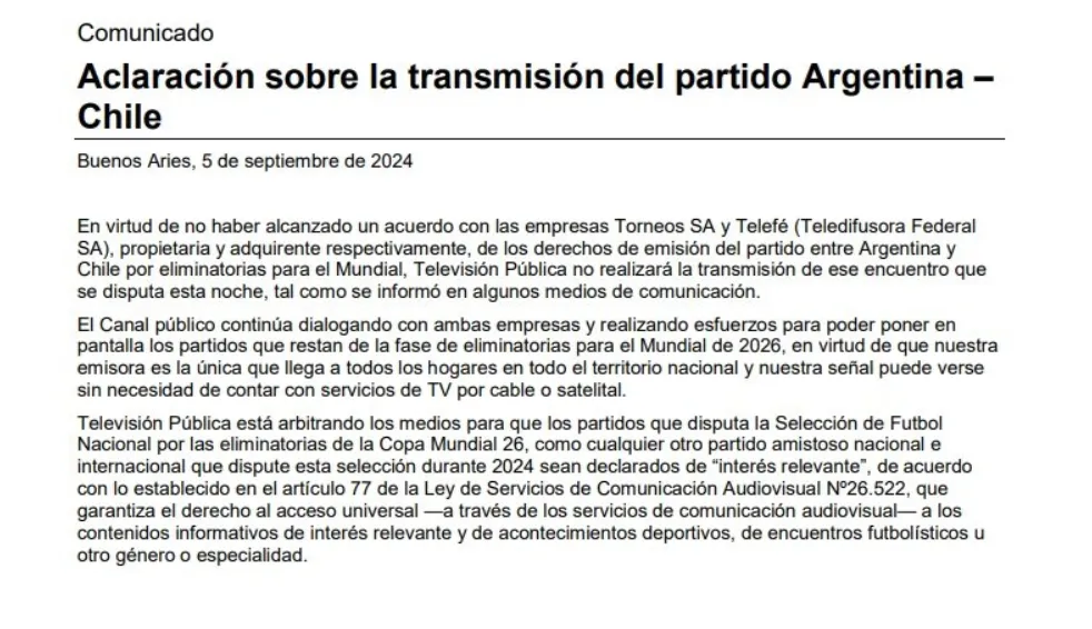 En virtud de no haber alcanzado un acuerdo con las empresas Torneos SA y Telefé (Teledifusora Federal SA), propietaria y adquirente respectivamente, de los derechos de emisión del partido entre Argentina y Chile por Eliminatorias para el Mundial, Televisión Pública no realizará la transmisión de ese encuentro que se disputa esta noche, tal como se informó en algunos medios de comunicación.
