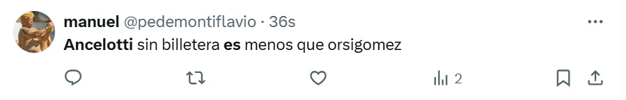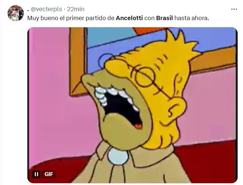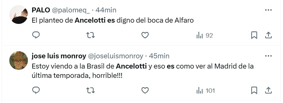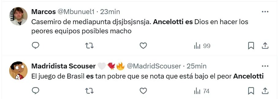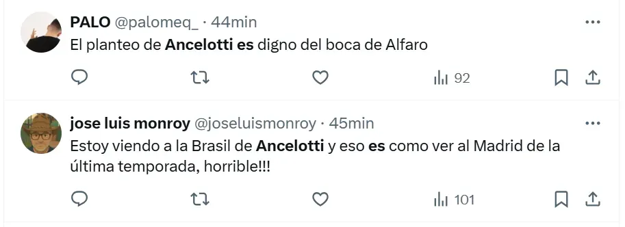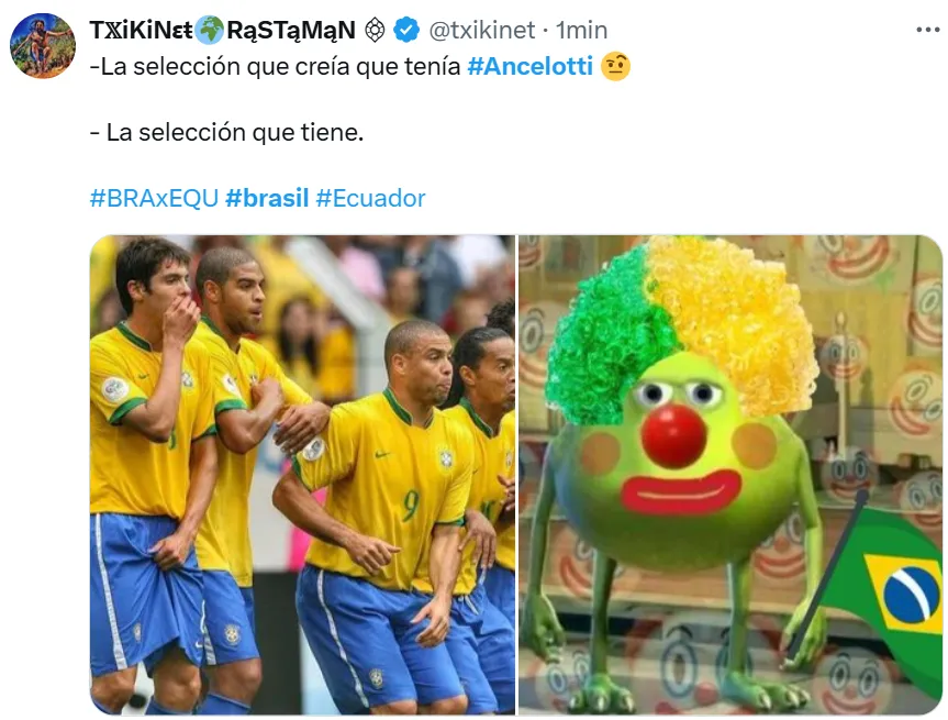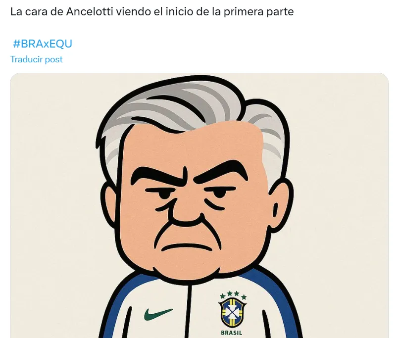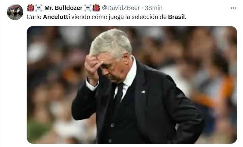 Lo cierto es que en X (ex Twitter) las reacciones de los fanáticos se hicieron presentes ante el estreno absoluto del director técnico de 65 años. Tal es así, que postearon imágenes, videos y comentarios inesperados, que están relacionados a lo que fue el nivel del equipo brasileño sobre el campo de juego ecuatoriano. Sin embargo, todos están vinculados a Ancelotti.