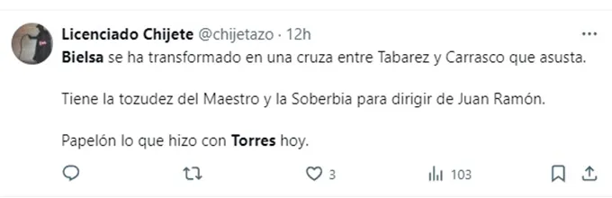 Otra decisión que le valió numerosas críticas al entrenador fue la doble variante que tuvo como protagonista a Facundo Torres, quien ingresó a los 54 minutos del partido ante Venezuela en reemplazo de Brian Rodríguez y dejó la cancha a los 86 para que ingresara Nicolás Fonseca. “Uno quiere bancarlo a Bielsa, pero es insólito”, escribió un hincha. “Bielsa puso a Torres y lo sacó. Nos avisaron de las Bielseadas y no creímos”, dijo otro. “Bielsa se ha transformado en una cruza entre Tabarez y Carrasco que asusta. Tiene la tozudez del Maestro y la soberbia para dirigir de Juan Ramón. Papelón lo que hizo con Torres hoy”, advirtió uno más.