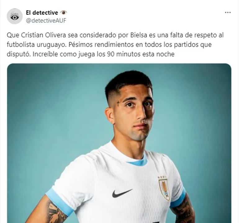 “Que Cristian Olivera sea considerado por Bielsa es una falta de respeto al futbolista uruguayo. Pésimos rendimientos en todos los partidos que disputó. Increíble como juega los 90 minutos esta noche”, escribió molesto un hincha en X. “¿De dónde habrá sacado Bielsa tantos perros? Se quiere hacer el descubridor de figuras y son todos horribles. No merecen vestir la celeste”, protestó otro. “Toma decisiones que solo él entiende. Pareciera que actúa más por capricho que en beneficio de la Selección. Por ahí no es”, resaltó un tercero.
