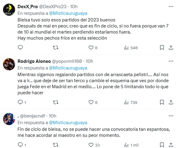 En las redes sociales tampoco faltaron los cuestionamientos para el Loco, con hinchas más que enojados por el presente de su selección. “Fin de ciclo”, “que deje de ser tan terco y cambie el esquema”, “no se puede hacer una convocatoria tan espantosa”, expresaron algunos fanáticos de la Celeste.
