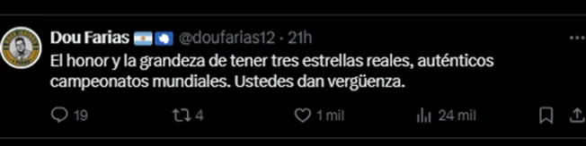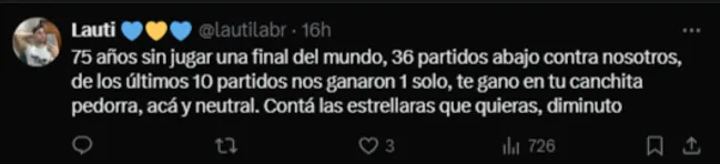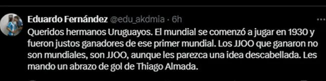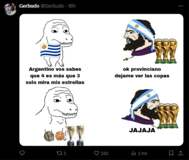 Las redes sociales de la selección uruguaya, previo al partido, habían compartido un posteo donde se veía el número 4, acompañado de la inscripción “estrellas”, haciendo referencia a sus “cuatro campeonatos mundiales” (dos fueron Juegos Olímpicos). Y claro, tras el triunfo argentino, ese posteo fue el elegido por los hinchas argentinos para contestar y burlarse de los uruguayos.
