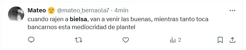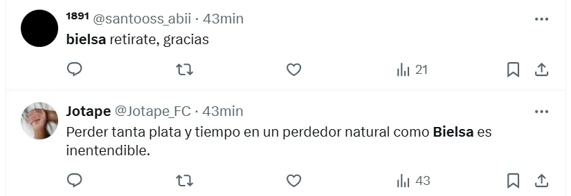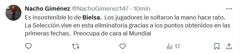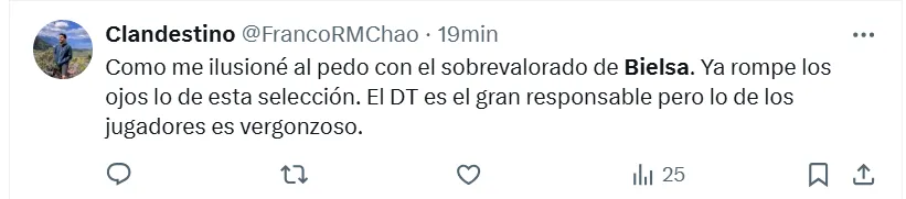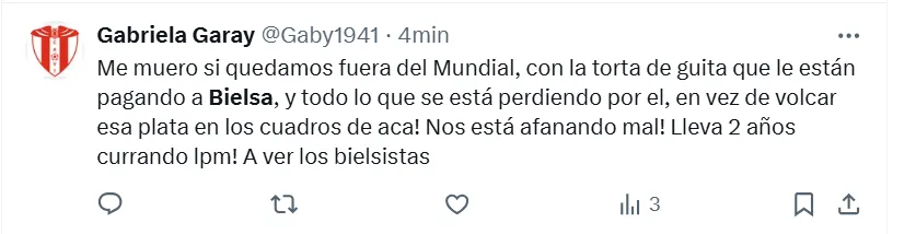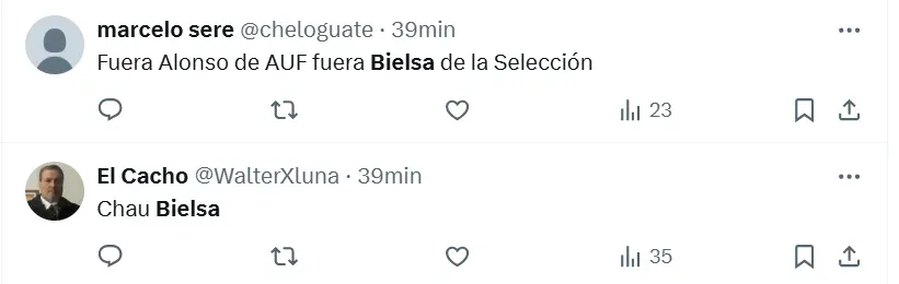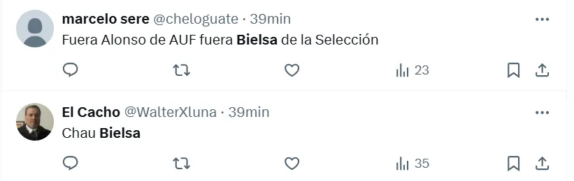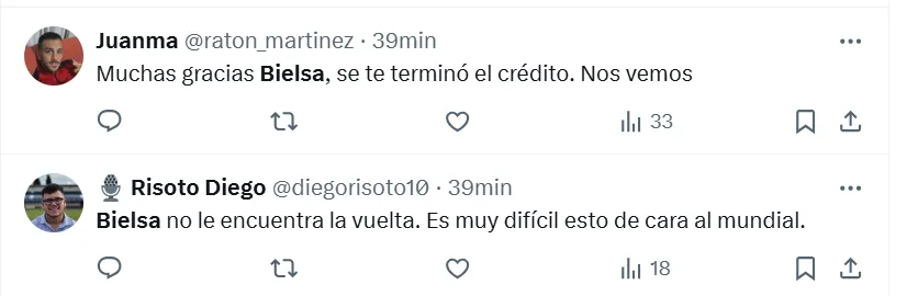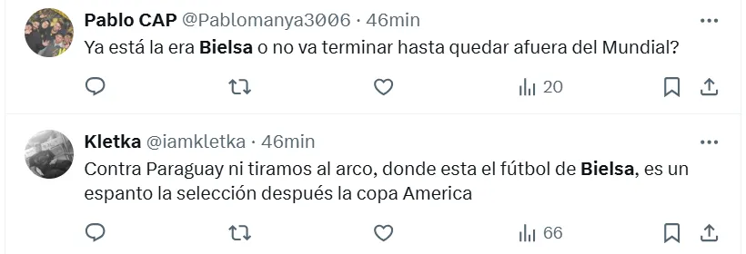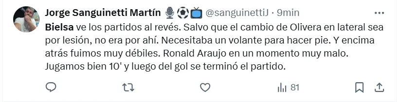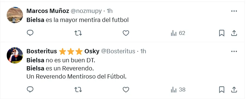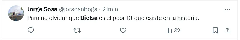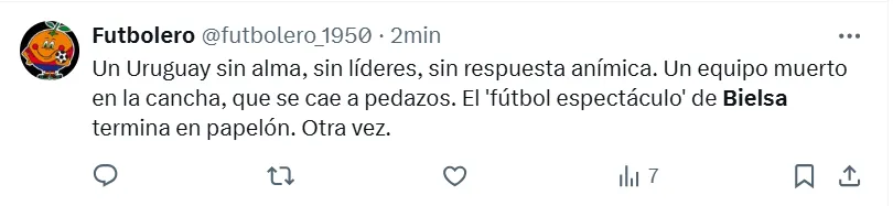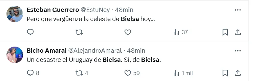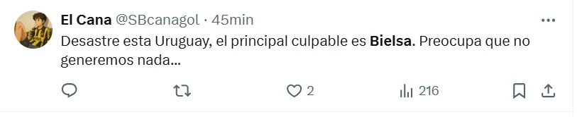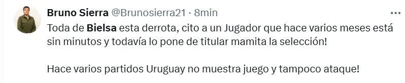 La noche del jueves estuvo muy lejos de ser la ideal para Marcelo Bielsa. Por la fecha 15 de las Eliminatorias Sudamericanas rumbo a la próxima Copa del Mundo, Uruguay perdió 2-0 ante Paraguay y la crisis futbolística se profundizó aún más. No solo eso, sino que además recibió una inmensidad de críticas de parte los fanáticos del seleccionado celeste en las redes sociales.
