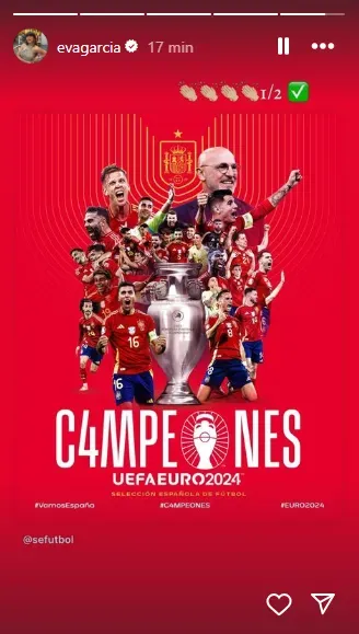 Eva García, pareja del futbolista del Manchester United, celebró la obtención de la Euro por parte de su seleccionado compartiendo la publicación de la cuenta oficial de España con el mensaje de “campeones”. Luego, un guiño para su novio en la previa a la final de la Copa América 2024 entre Argentina y Colombia: “1 de 2”.