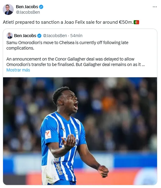 Si bien la llegada de Samu Omorodion al Chelsea era clave para que Atlético de Madrid depositara el dinero para quedarse con el pase de Julián Álvarez, lo cierto es que la rápida reacción del Colchonero para intentar vender a Joao Félix podría salvar la operación completa, incluyendo el fichaje de Connor Gallagher desde Chelsea.