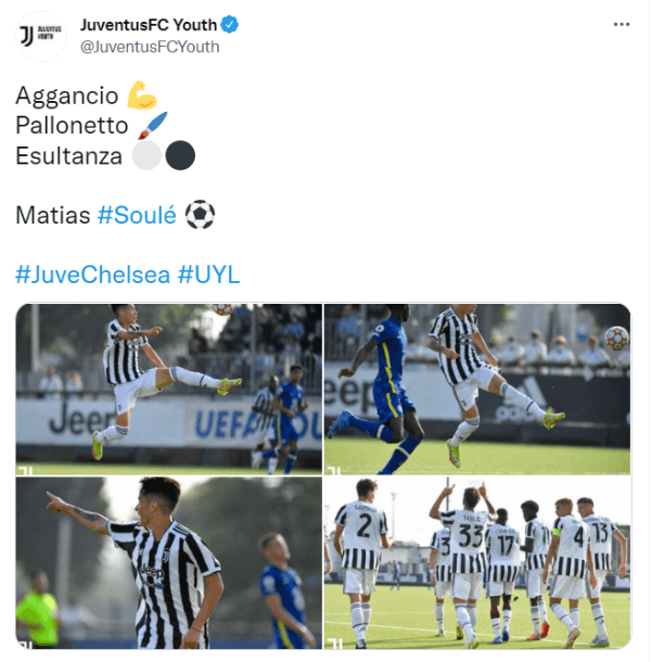El argentino lleva más de año y medio militando en el equipo Primavera (Sub 23) de la Juventus y viene sumando minutos como titular. Este miércoles, en el marco de la UEFA Youth League, Soulé anotó uno de los goles de la fecha emulando la definición característica de ÁngelDi María. Después de una gran asistencia desde atrás de la mitad de la cancha, el extremo controló la pelota y se la picó al arquero. ¡Golón!