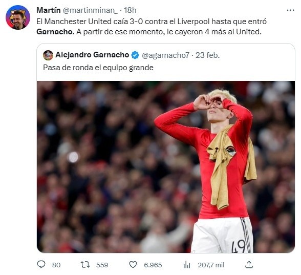 Las imágenes que más circularon en redes sociales con respecto a Garnacho estuvieron relacionadas al posteo que realizó tras vencer al Blaugrana hace unas semanas. “Pasó el equipo grande”, había posteado el atacante en su cuenta de Twitter para la bronca de toda la fanaticada del Barcelona.