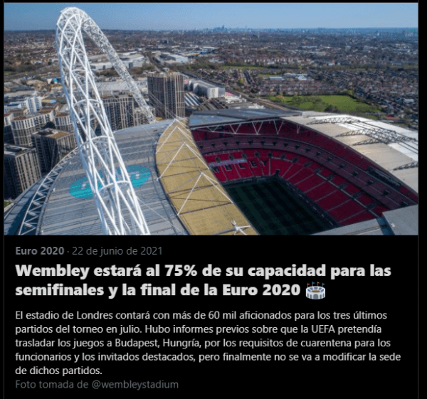 La competencia europea tiene distintas sedes hasta el momento de las semifinales, donde se confirmó que los últimos tres partidos de la Eurocopa serán en la ciudad donde nació el fútbol: Londres. El mítico estadio de Wembley abrirá sus puertas para hospedar la parte final del campeonato.