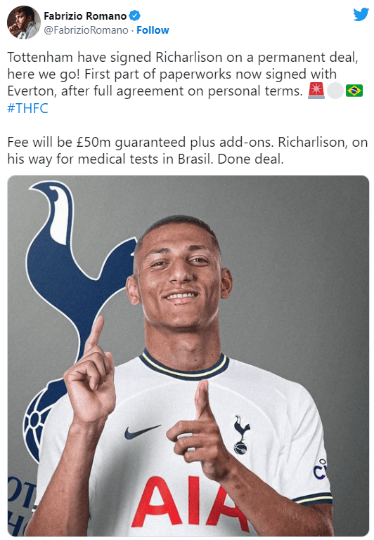 “Tottenham llegó a un acuerdo conRicharlison. Ya se firmaron los primeros papeles con el Evertontras acordar completamente lostérminos personales con el jugador”, informó el n° 1 en información del mercado de pases. Los Spurs abonarán 50 millones de libras esterlinas, sin contar los bonos adicionales que se puedan llegar a cumplir durante la temporada. Chequeos médicos inminentes.