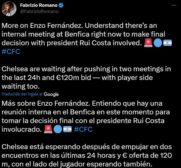 Mientras tanto, tanto en Inglaterra como en el entorno de Enzo Fernández esperan la respuesta que pueda dar el club para poder seguir avanzando. Una cuestión que ya se maneja a contrarreloj debido a que el mercado de pases cierra a última hora del próximo martes 31 de enero.