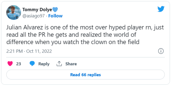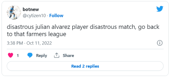 En las redes, algunos simpatizantes del City apuntaron contra él, aunque queda claro que estuvo lejos de ser responsable del discreto rendimiento general del equipo. Algunas tuvieron tanta repercusión que hasta generaron enojo de los argentinos. Paciencia.