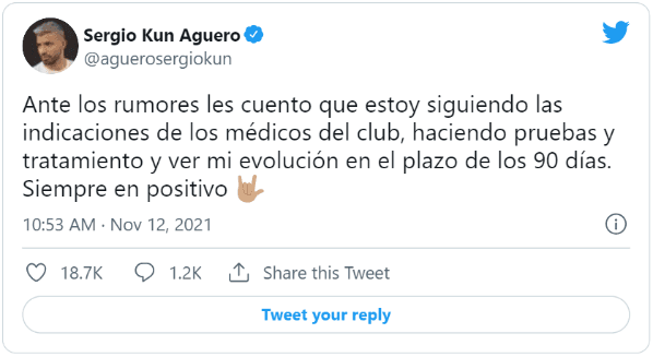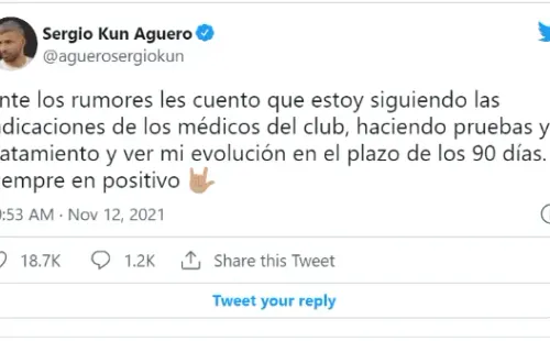 “Ante los rumores les cuento que estoy siguiendo las indicaciones de los médicos del club, haciendo pruebas y tratamiento y ver mi evolución en el plazo de los 90 días. Siempre en positivo”, expresó el ex-Manchester City en su cuenta oficial de Twitter. Tranquilidad.