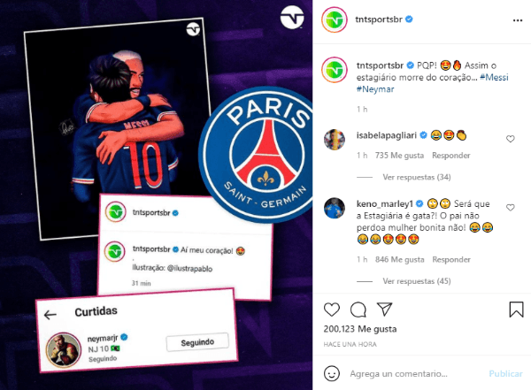 El CM de la cuenta de TNT Sports Brasil se dio cuenta inmediatamente del like de Ney y lo publicó en la misma red de Instagram para darle más difusión a un rumor que no para de crecer, vinculado al futuro de Lionel Messi y la chance de que siga vistiendo el rojo y el azul, pero en el fútbol de Francia.