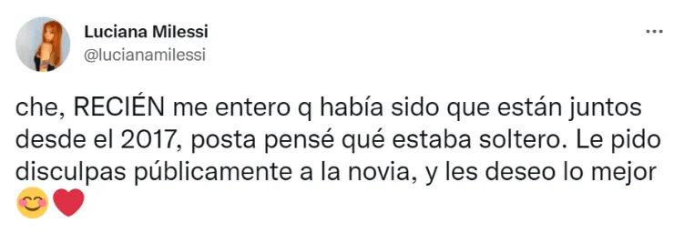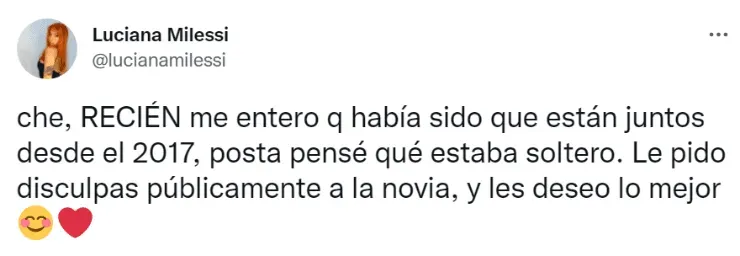 “Che, recién me entero que había sido que están juntos desde el 2017, posta pensé qué estaba soltero. Le pido disculpas públicamente a la novia, y les deseo lo mejor”, indicó Luciana Milessi en Twitter, lamentándose por sus dichos enElo Podcast. ¿Habrá aceptación de las disculpas por parte de Julián Álvarez?