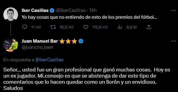Por supuesto, el posteo de Casillas en las redes sociales despertó mucho enojo por parte de los argentinos que salieron a contestar en defensa del 10: “Usted fue un gran profesional que ganó muchas cosas. Mi.consejo es que se abstenga de dar este tipo de comentarios que lo hacen quedar como un llorón y un envidioso“, respondió Juan Manuel Bar (arquero de la Selección Argentina de Handball) entre otros.