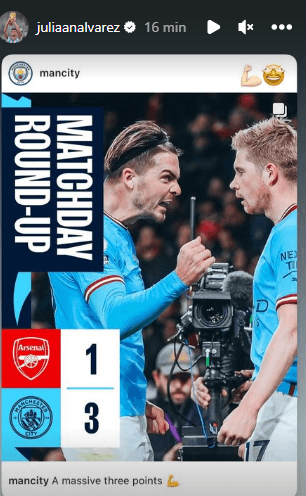 Luego del partido, la Araña, subió una historia en su cuenta de Instagram. La misma, es la publicación de la cuenta oficial del Manchester City, con una foto de Grealish y De Bruyne, informando el resultado titulado “Unos tres puntos masivos”. El delantero, a esta publicación, le agregó dos emojis, celebrando la victoria de su equipo.