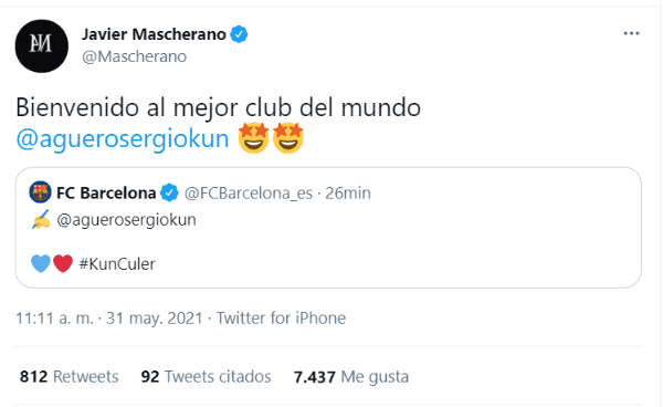 Esta noticia tapó todo lo que está pasando con el Kun, aunque varios siguen enfocados en la incorporación bomba que hizo el equipo de Lionel Messi. Entre ellos Javier Mascherano, que tiró un posteo apenas vio la foto de su compatriota con los colores blaugrana, para enloquecer a todos los hinchas de una institución donde supo brillar.