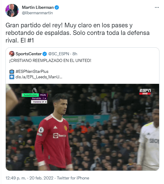 Martín Liberman, periodista y admirador deCR7,le dedicó un tuit que se hizo viral por la manera en que defendió al futbolista: “Gran partido del rey! Muy claro en los pases y rebotando de espaldas. Solo contra toda la defensa rival. El #1”. ¿Qué opinas?