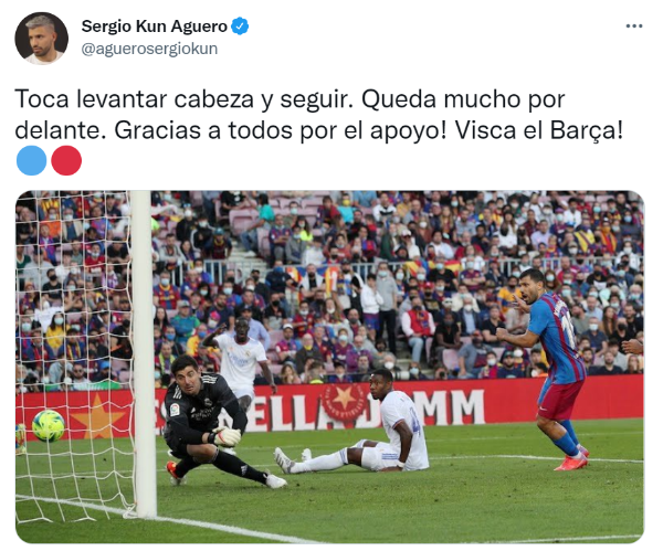 “Toca levantar cabeza y seguir. Queda mucho por delante. Gracias a todos por el apoyo! Visca el Barça!”, escribió Sergio Agüero en su cuenta de Twitter, quien disputó 24 minutos en el Camp Nou y, en tiempo adicionado, anotó su primer gol con la camiseta del Barcelona.