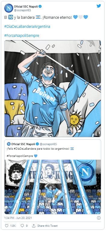 “El 10 y la bandera. ¡Romance eterno! ¡Feliz Día de la Bandera para todos los argentinos! Por Diego nuestra camiseta también es celeste y blanca. ¡VAMOS DIEGO. VAMOS ARGENTINA!”, escribió el CM del Napoli. Lo visual del tuit es lo más espectacular: imagen de Diego sosteniendo una bandera de Argentina,la camisetadel club italiano sobre su pecho y una foto del plantel actual con la casaca especial con bastones albicelestes.