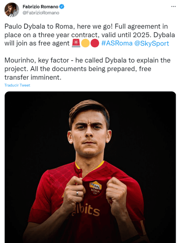 Según especifica Romano, Dybala tendrá un contrato de tres temporadas de duración (hasta 2025) y no trascendieron las cifras de su contrato. El crack de la Albiceleste ahora será dirigido por José Mourinho, uno de los entrenadores más prestigiosos del mundo, y tendrá prácticamente asegurado su lugar en el XI titular de la Roma. Eso sí, sorprende la decisión de Paulo en no firmar con un equipo que dispute la Champions League.
