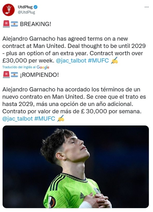 “Alejandro Garnacho acordó los términos de un nuevo contrato en Manchester United. Se cree que el trato tendrá duración hasta 2029, más una opción de un año adicional. Su salario tendrá un valor aproximado a los£30,000 por semana”, escribió el periodista vía Twitter.