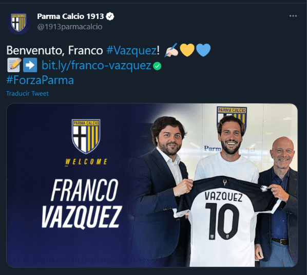 Según indicó el propio Parma, que buscará retornar a la máxima división del fútbol italiano lo más rápido posible, Vázquez, nacido en Tanti, provincia de Córdoba, firmó un contrato hasta junio de 2023 y con una opción de prórroga hasta junio de 2024. De hecho, el talentoso mediocampista ofensivo ya posó con sus nuevos colores.