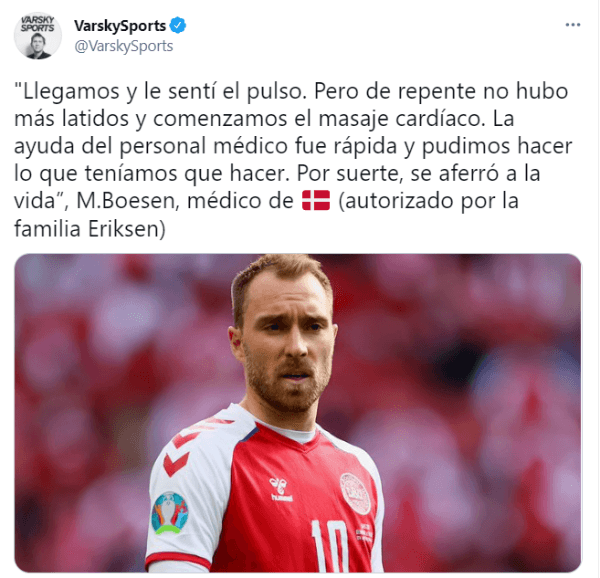 “No sé si volverá a jugar al fútbol.Con franqueza, el jugador murió,aunque fuese por unos minutos, pero murió.¿Un profesional médico le permitiría morir de nuevo? La respuesta es no. La buena noticia es que Eriksen vivirá, la mala noticia es que está llegando al final de su carrera”, declaróSanjay Sharma con preocupación.