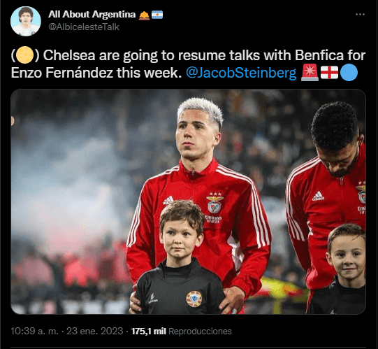 El periodistaJacob Steinberg del famoso periódico británico The Guardian informó que la intención de Chelsea es reanudar charlas con Benfica por el pase de Enzo esta semana. Además, jornalistas encargados en el día a día de los de Stamford Bridge confirmaron que se espera que el Chelsea se acerque a Lisboa nuevamente con otra propuesta por Enzo Fernández antes de que cierre la ventana de fichajes.