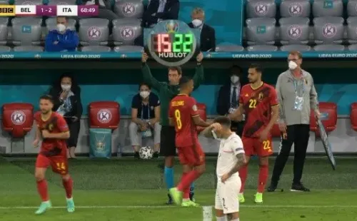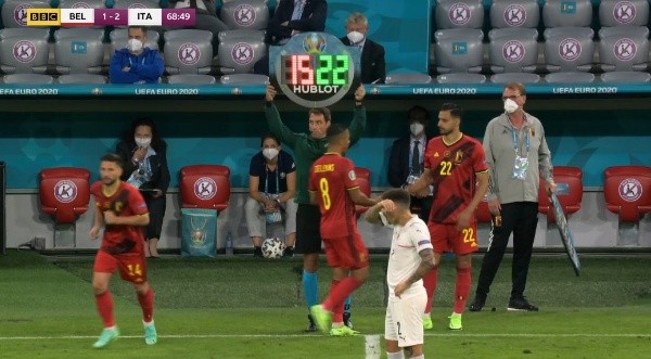 Dentro de un intenso duelo entre dos candidatazos a quedarse con la Euro, un momento gracioso -menos para Bélgica- se volvió viral rápidamente. A los 68 minutos de juego, Roberto Martínez mandó a la cancha aNacer Chadlien reemplazo deThomas Meunier y, segundos más tarde, el jugador acusó una molestia y tuvieron que reemplazarlo. Entre cambio y cambio, solo pasaron cinco minutos ¡Increíble!