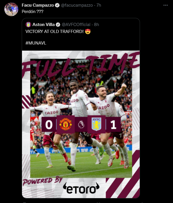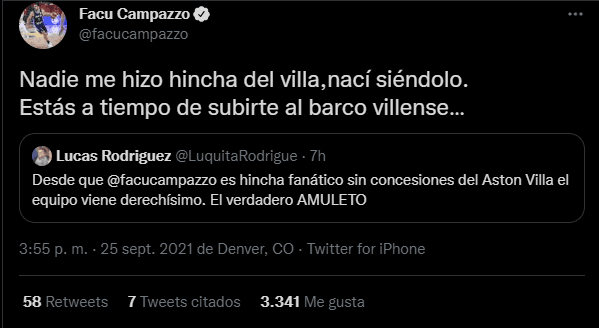 Facu se encuentra en Denver actualmente, ya que está haciendo la pretemporada con los Nuggets de cara a la próxima temporada NBA, y desde allí observó y festejó por los tres puntos de Aston Villa obtenidos en Old Trafford. ¿Dibu hará lo mismo en los partidos de Campazzo?