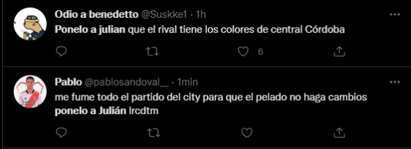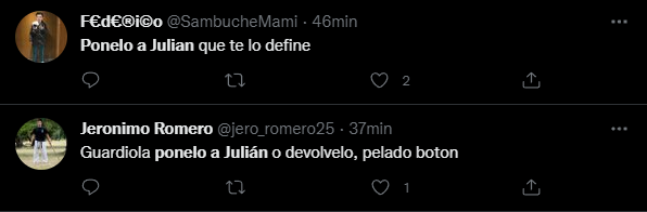 Sorpresivamente, y pese a que el resultado no fue el esperado para el Manchester City, Guardiola hizo un solo cambio y fue obligado debido a la lesión de Nathan Aké, quien salió en lugar de Ruben Dias. De esta manera, Julián Álvarez vio los 90 minutos desde el banco de suplentes, algo que sin dudas hizo estallar a los argentinos en las redes, quienen no perdonaron al entrenador catalán e hicieron tendencia la frase “ponelo a Julián“.