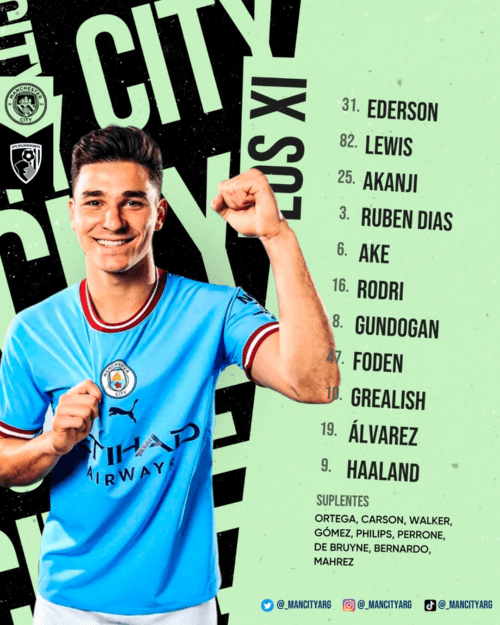 En este contexto, el entrenador del vigente campeón de la Premier League tomó la decisión de poner a Álvarez de titular este sábado. La Araña hará dupla con Erling Haaland en ataque para enfrentar al Bournemouth en condición de visitante. ¡A romperla, Julián!