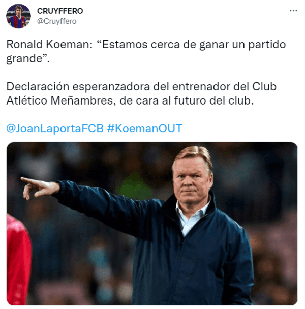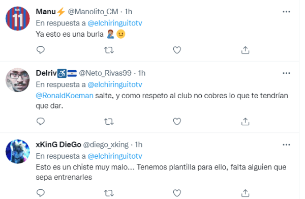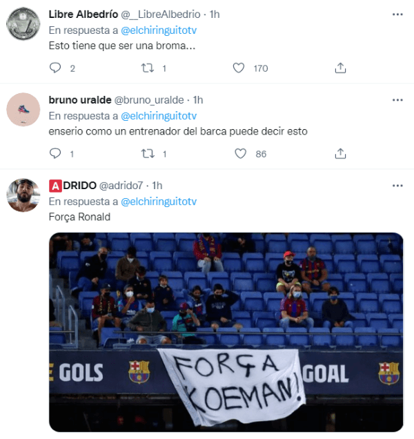 Sus palabras no tardaron en hacerse virales en redes sociales y el fastido de la hinchada culé fue unánime, muchos de ellos hasta ofendidos por los dichos del entrenador. Nadie sabe lo que pasará con el futuro de Ronald Koeman al frente del banquillo del Barcelona, pero lo sucedido hoy en el Camp Nou parece haber roto definitivamente la relación entre el DT y los fanáticos.