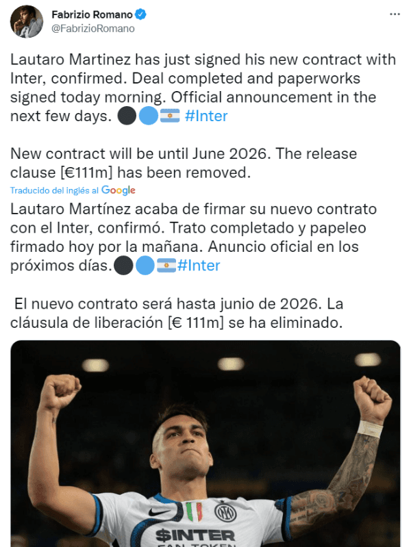 Además, el corresponsal de Sky Sports reveló que la cláusula de rescisión que existía, rondando los 111 millones de euros, fue removida. Por este motivo, ningún club podrá cancelar el nuevo vínculo que firmó Lautaro con el Inter con el solo hecho de depositar el dinero. Para ello habrá que negociar con el Nerazzurri o bien esperar al 2026, cuando el delantero quede en libertad de acción.