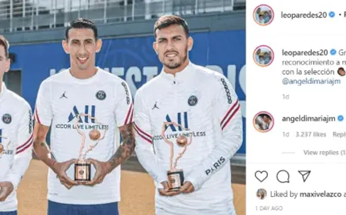 “Gracias@psgpor el reconocimiento a nuestro gran logro con la selección @leomessi@angeldimariajm”, escribió Paredes mostrando una foto del momento.