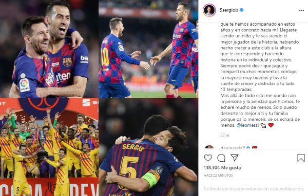 Si algo faltaba para confirmar la salida de Lionel del club que lo vio brillar era la despedida de uno de sus compañeros durante los años dorados del Barcelona. Sergio Busquets le dedicó un sentido texto en su cuenta de Instagram por todo lo que han pasado juntos, entre títulos, anécdotas y festejos. Realmente emocionante.