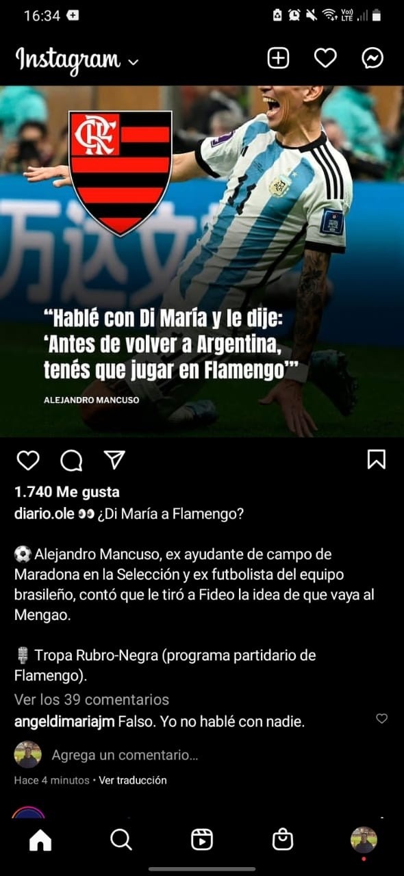 Después de que todos los medios de comunicación levantaran las declaraciones del ex Boca, fue el propio Di María quien tomó su cuenta de Instagram y, a través de la publicación que realizó Olé, comentó: “Falso. Yo no hablé con nadie”.