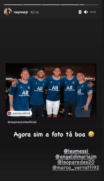 A la imagen dada en Ibiza de Messi, Di María, Paredes, Neymar y Marco Verratti, el brasileño encontró una edición de los cinco, incluyendo a Leo, con la camiseta del PSG. Obviamente que no la dejó pasar y la posteó en su historia de Instagram con la frase “¡ahora la foto es buena!” y arrobó a todos los jugadores. Crack.