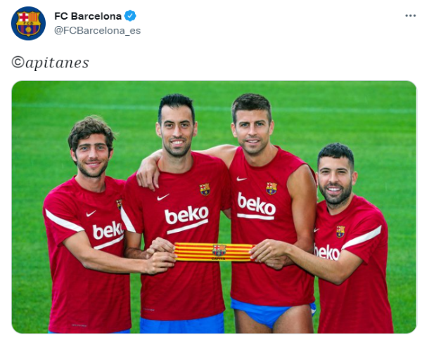 En la foto publicada por el Barcelona aparecen cuatro figuras de la institución, quienes serán los capitanes del club durante este ciclo. A Busquets le seguirá Gerard Piqué como segundo portador de cinta y la lista la completan Sergi Roberto y Jordi Alba, en ese órden.