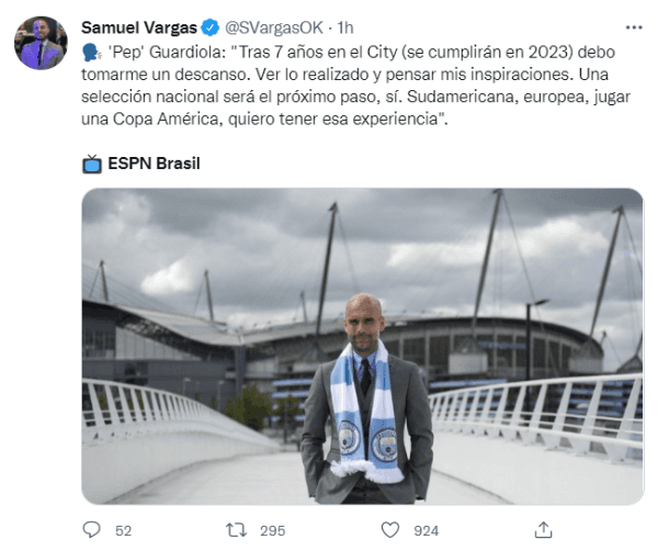 En diálogo con ESPN Brasil, Guardiola declaró que cumplirá su contrato hasta 2023 y ya se plantea un nuevo desafío en su carrera. “Quiero ver lo realizado y pensar mis inspiraciones.Una selección nacional será el próximo paso, sí. Sudamericana, europea, jugar una Copa América, quiero tener esa experiencia”, sentenció el DT abriendo puertas a un reto inédito en su trayectoria.
