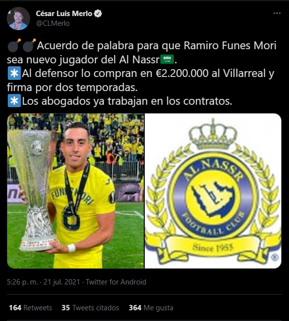 Esta información la difundió César Luis Merlo, quien es un conocido del mercado de pases del fútbol argentino o que vincula a argentinos. En su Twitter posteó: “Acuerdo de palabra para que Ramiro Funes Mori sea nuevo jugador del Al Nassr“.